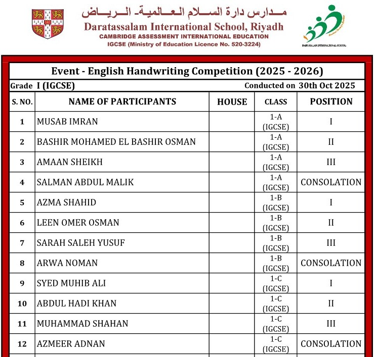11. English Handwriting Competition (Grade-1)