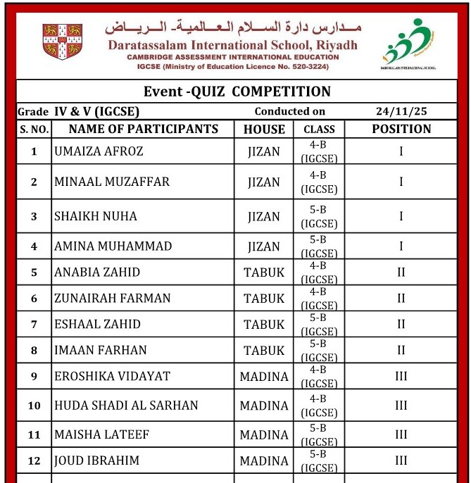 16. Quiz Competition (Grade-4 & 5) Girls